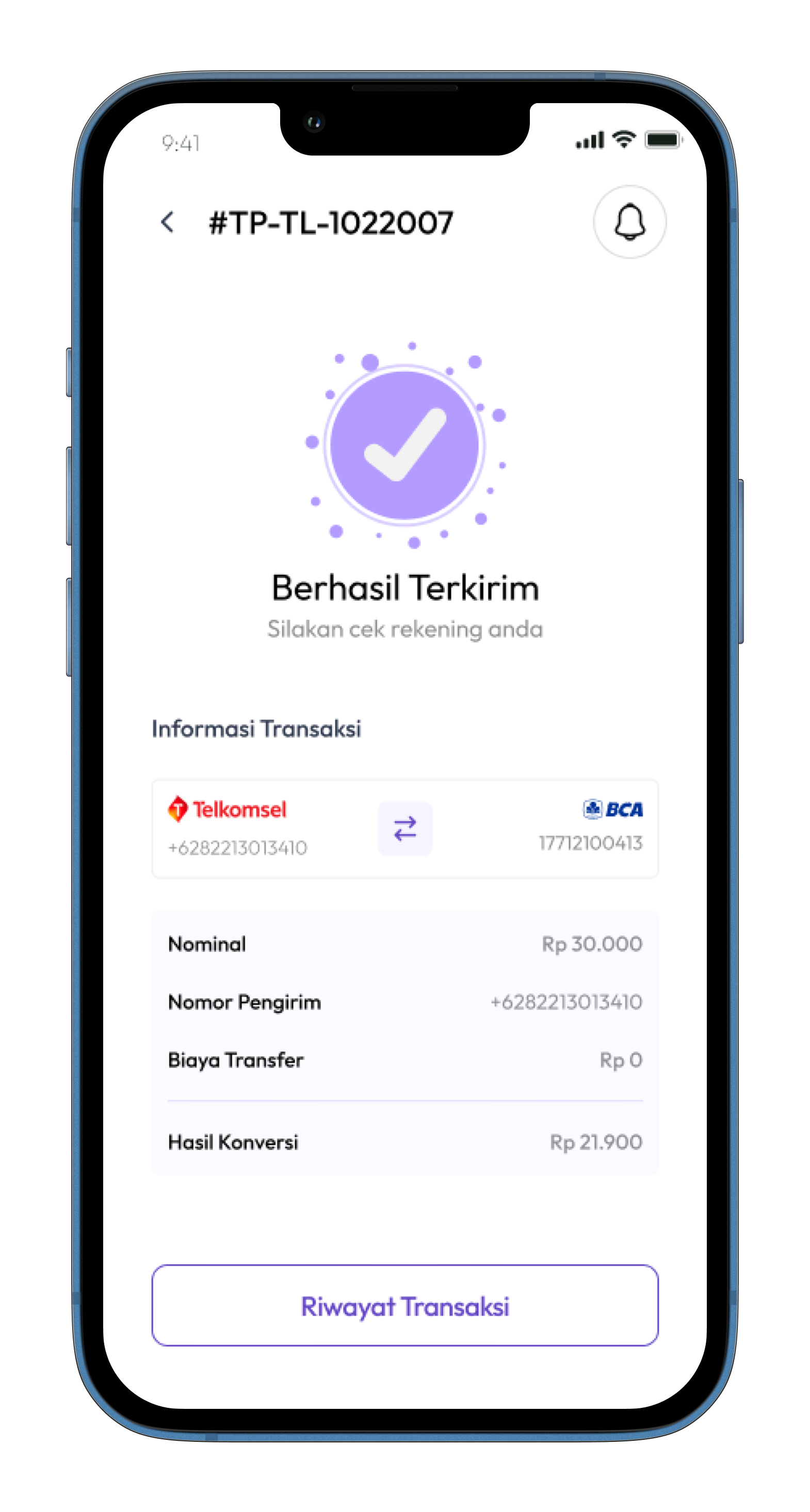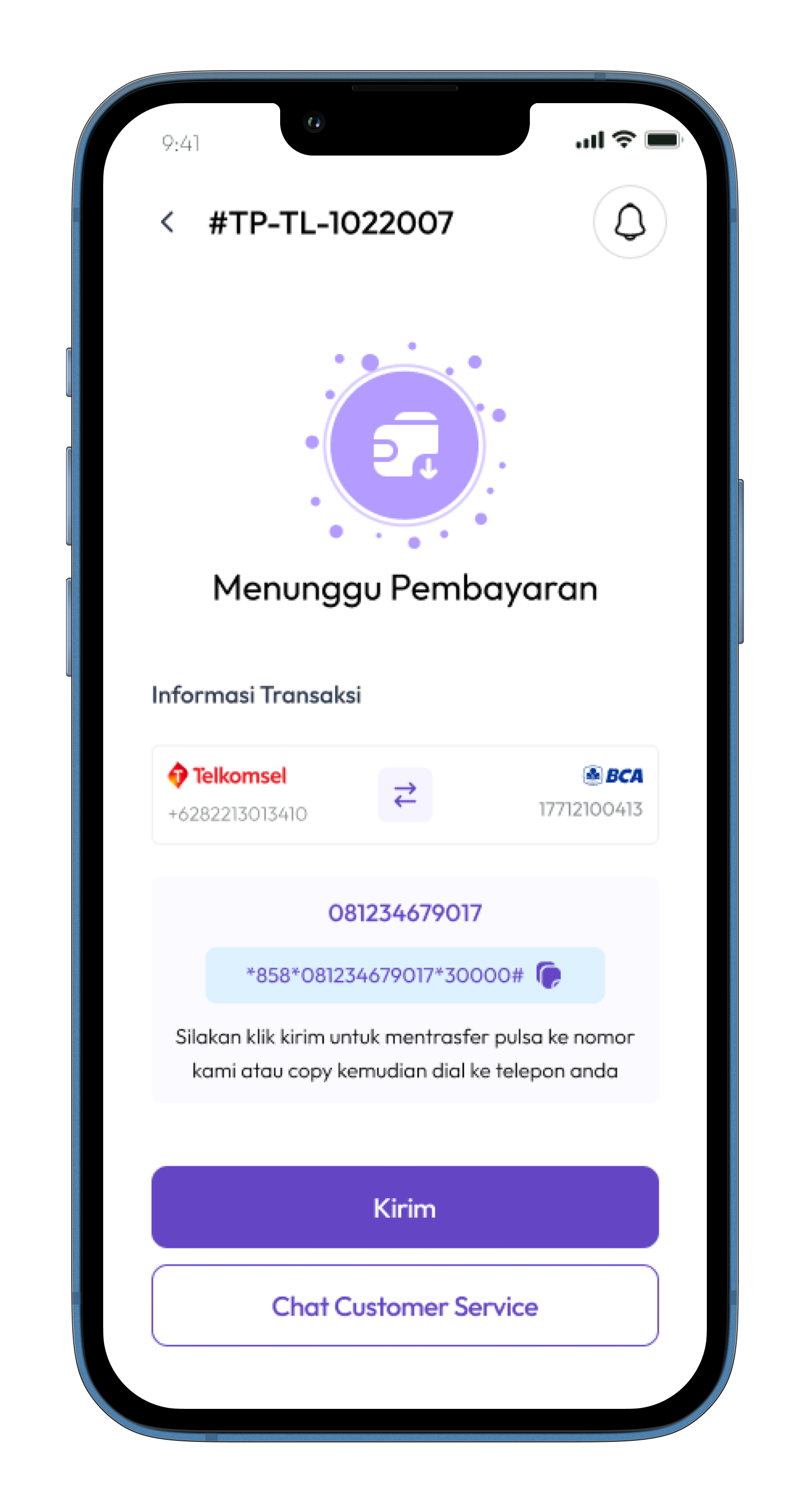 Kirim bukti transfer atau konfirmasi (jika bukti tidak keluar dan pulsa sudah terpotong) melalui Chat Customer Service