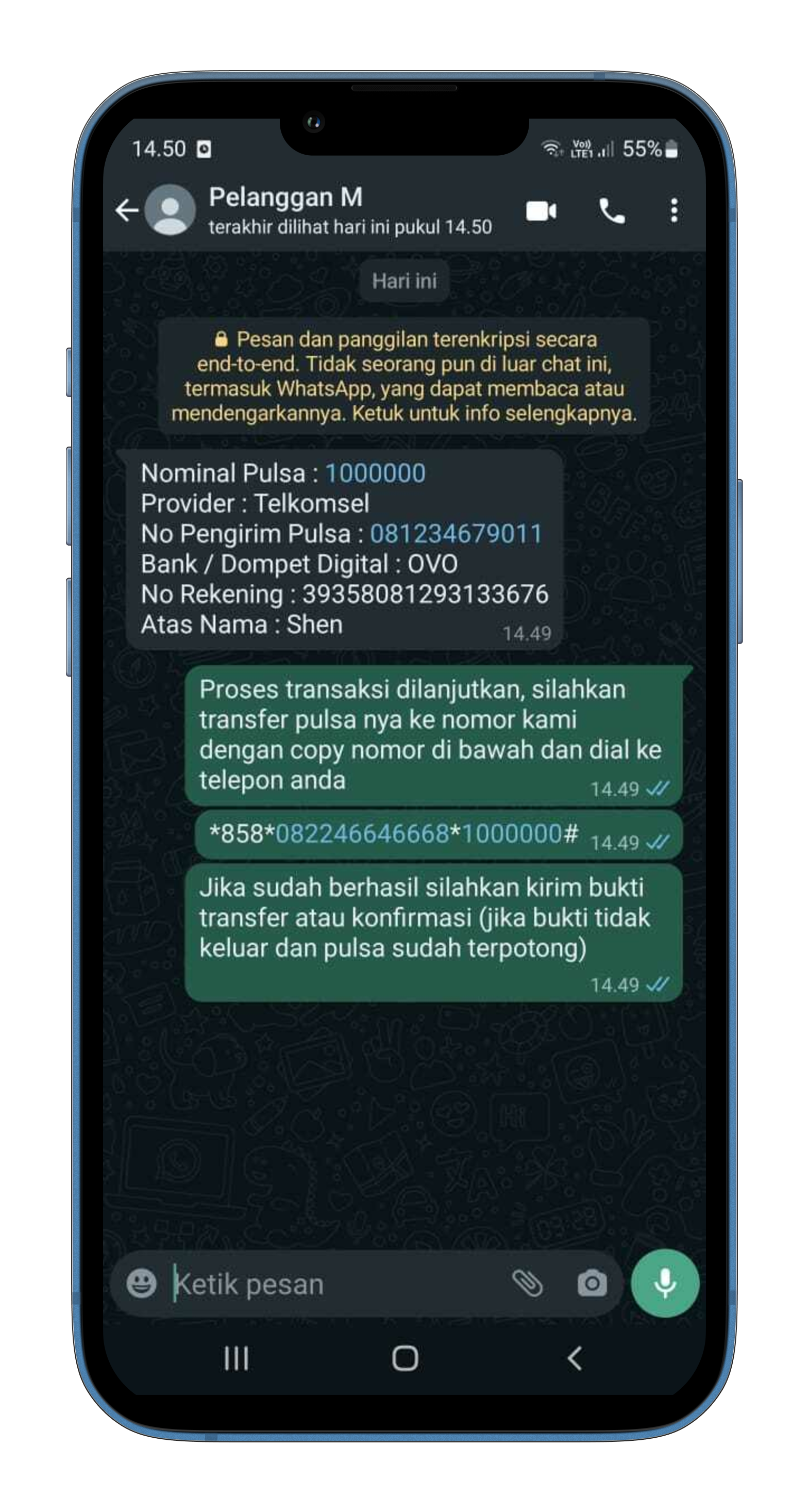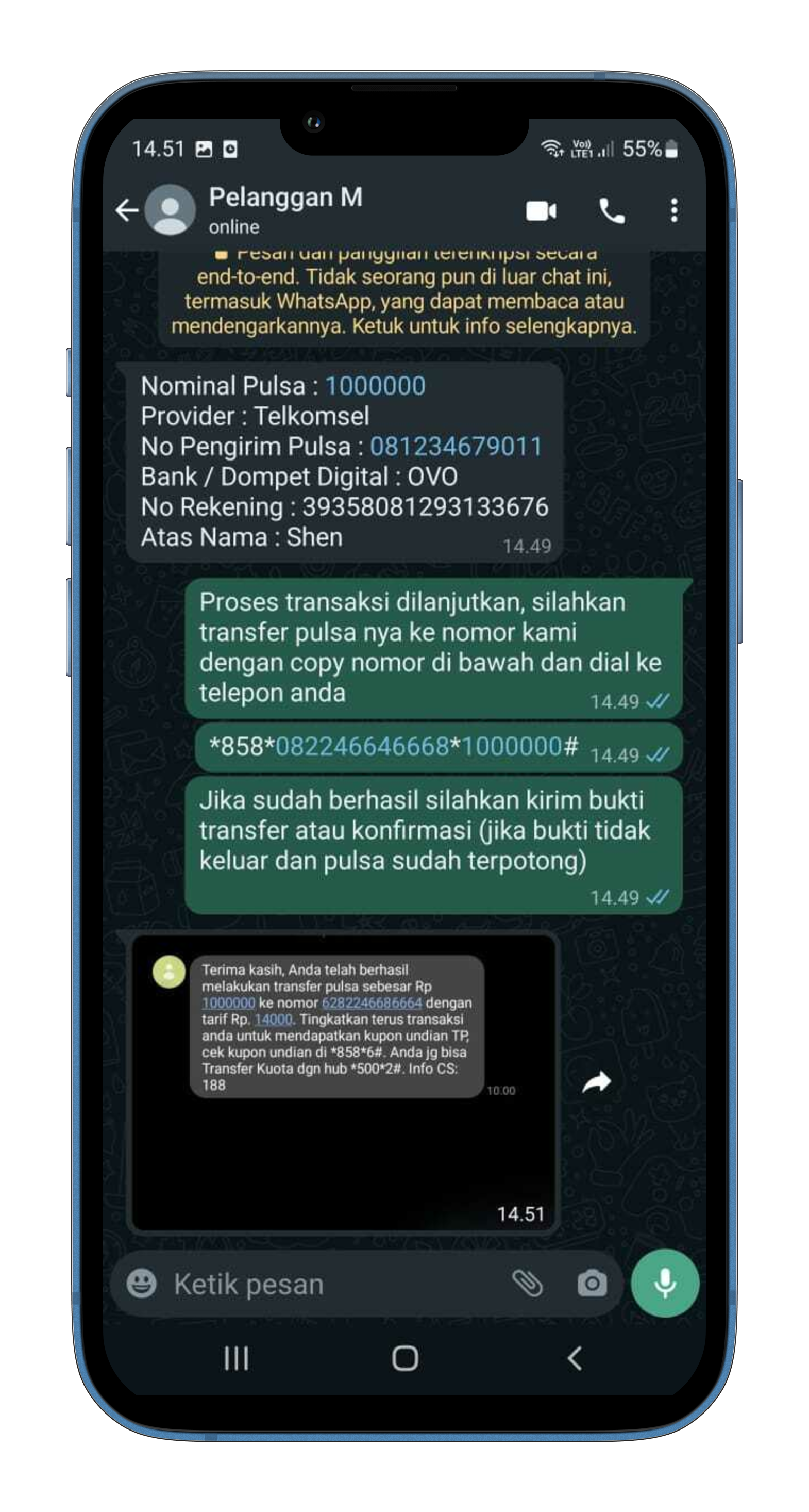 Setelah transfer pulsa berhasil kirimkan bukti transfer pulsa atau konfirmasi (jika bukti tidak keluar dan pulsa sudah terpotong) ke admin