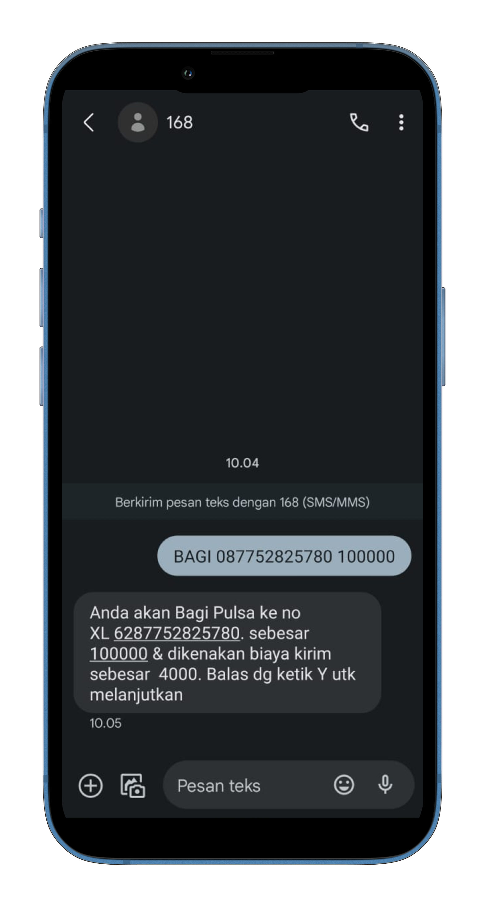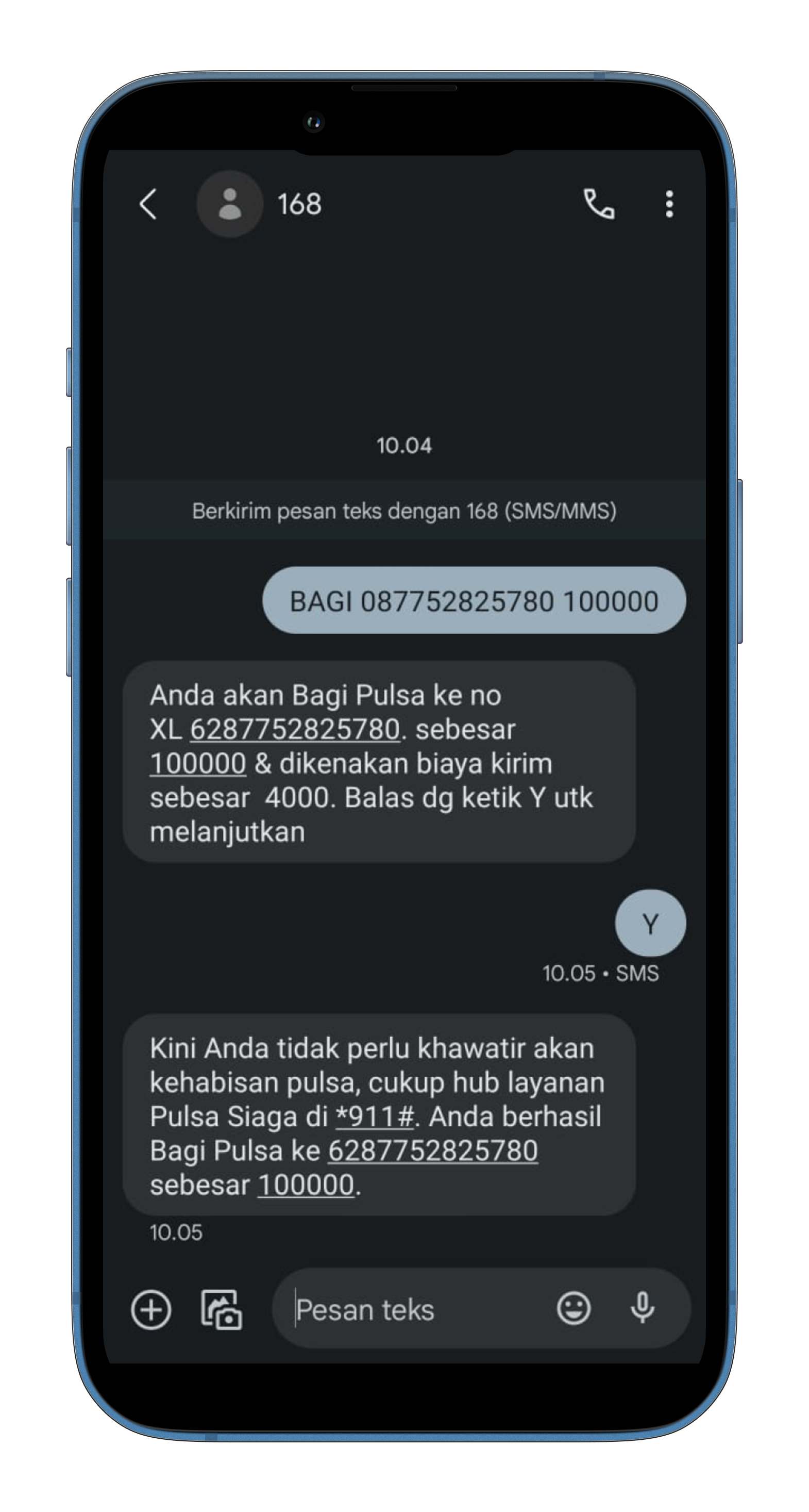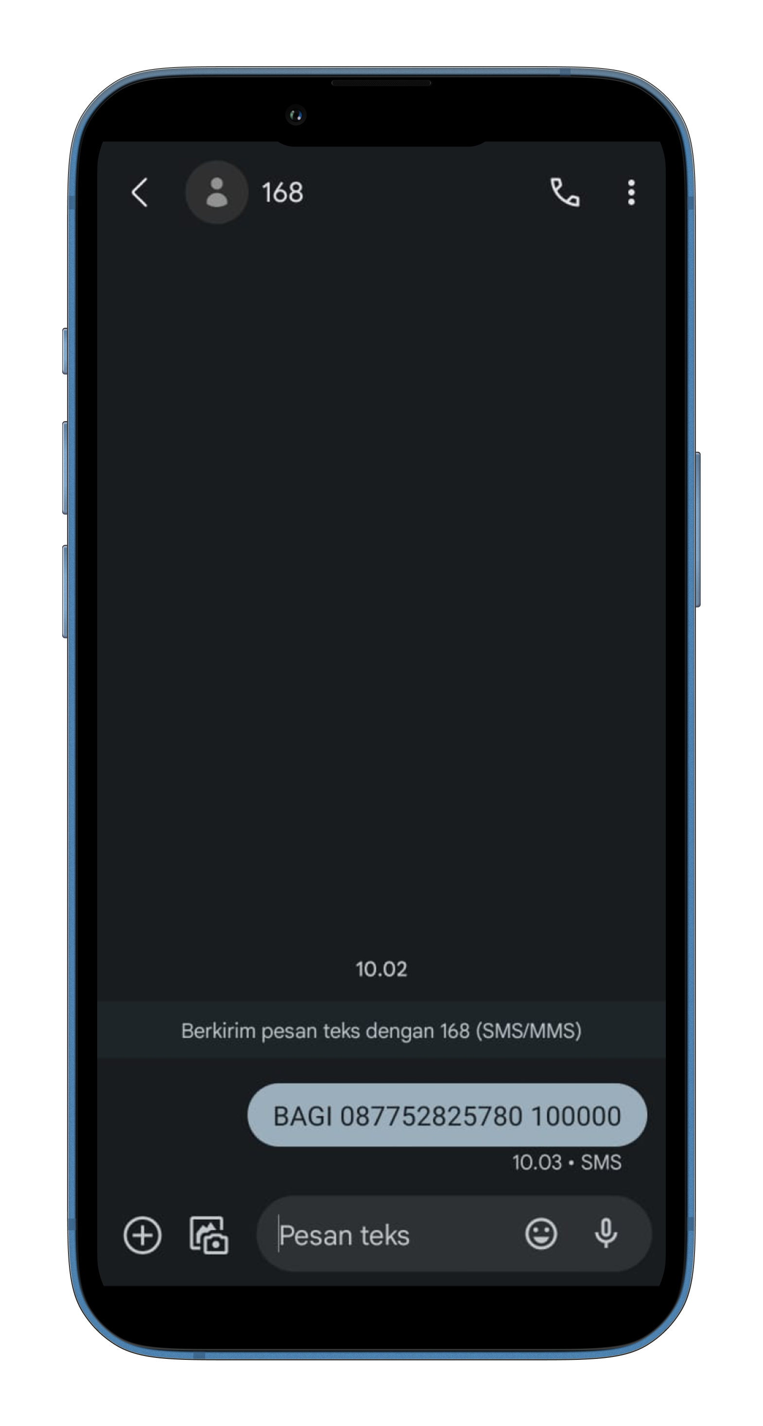 Masuk ke menu SMS. Ketik BAGI(spasi)NOMOR PENERIMA(spasi)JUMLAH PULSA. Kirim pesan ke nomor 168.